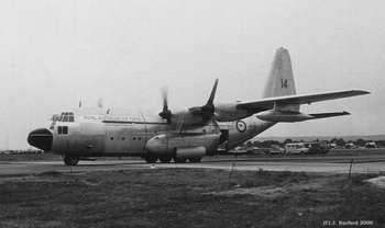 C-130A第一种生产型。装4台T56-1A涡桨发动机,单台功率2,296千瓦(3,750轴马力)。三桨叶螺旋桨直径4.6米,总燃油量19,865升,后又增装两个容量各为1,705升的翼下副油箱。最大起飞重量56,337千克,有效载重15,876千克,航程是3,520千米。1955年4月7日首次试飞,1956年12月开始交付使用,1959年2月停产,共生产231架,其中包括澳大利亚空军使用的11架。最初的27架使用AN/AN-42雷达,后期采用AN/APN-59,机首因此增大,结果获得了“小木偶鼻”的外号。